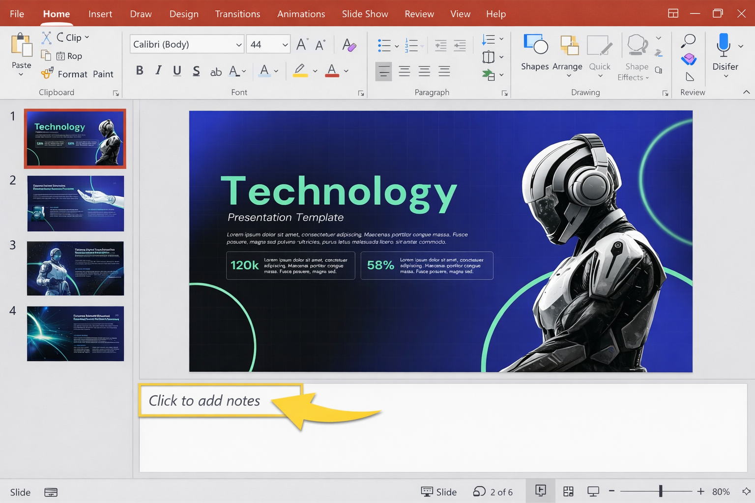 Open your presentation in PowerPoint. At the bottom of the screen, you will see a bar that reads “Click to add notes.” Click it and start typing. If the panel is not visible, go to the View tab and select Notes. You can drag the top edge of the panel upward to give yourself more room to write.