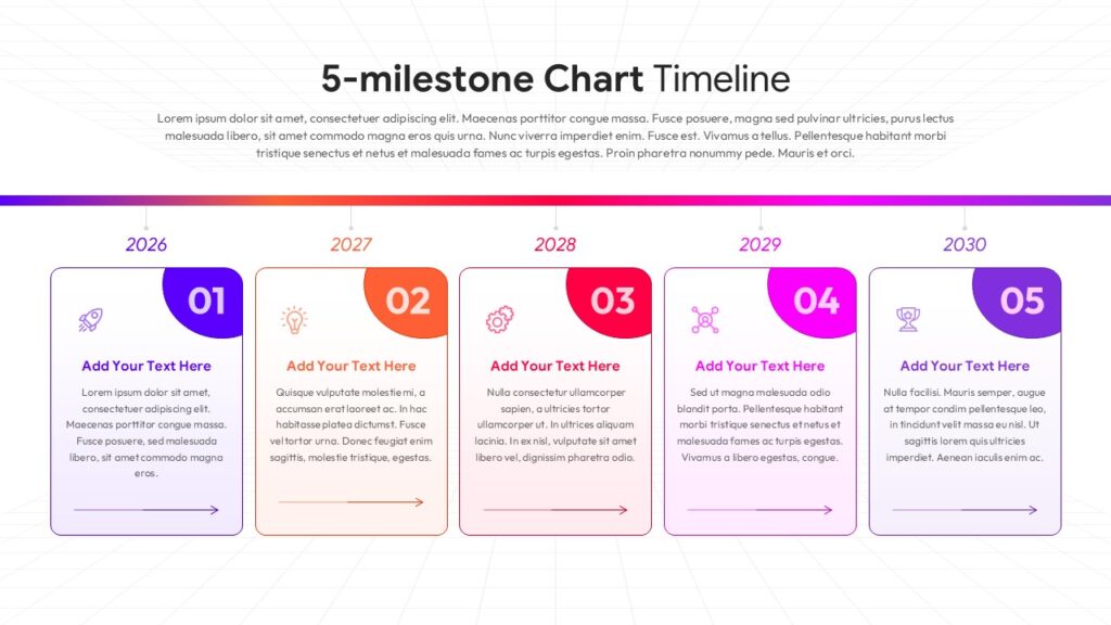 Five sequential milestone cards span 2026 to 2030, each numbered 01 to 05 and paired with a unique icon that reflects the natural arc of any ambitious project. A vibrant gradient timeline bar connects every stage with directional flow indicators, keeping the story moving forward naturally. Colour-coded milestone badges in purple, orange, and pink tones give each phase a distinct visual identity that any audience can follow at a glance.