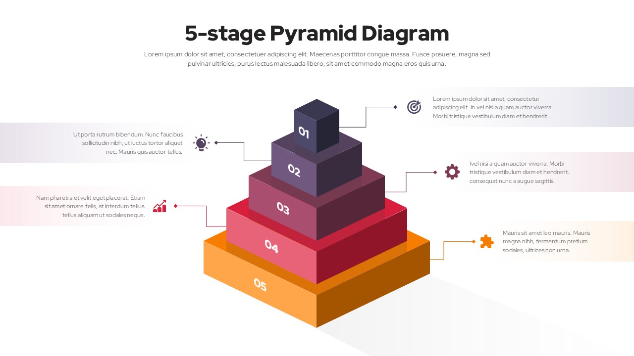 This 5 stage pyramid infographic hierarchy is designed to present layered concepts, priorities, or progression models in a clear and visually compelling structure. The slide features a three-dimensional pyramid divided into five stacked levels, each distinctly colored and numbered to guide the audience from the foundational stage to the top objective. Callout lines with icons and text blocks on both sides provide space to explain each level in detail, making complex hierarchies easier to understand and communicate.