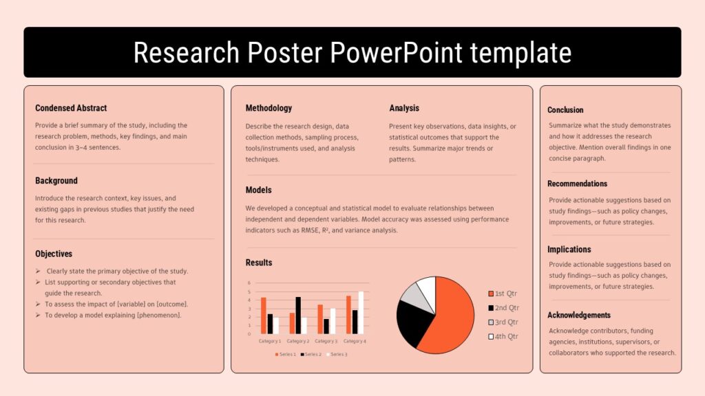 • Dedicated areas for abstract, methodology, analysis, results, and conclusions.