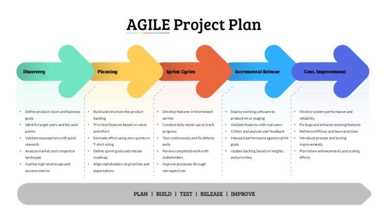 Agile project plan slide showing five arrow stages from discovery to continuous improvement with detailed steps.