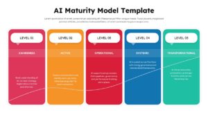This AI maturity model slide is designed to clearly illustrate the progressive stages of artificial intelligence adoption within an organization. The layout presents five structured vertical columns, each representing a maturity level, from early awareness to full transformation. Distinct color blocks and clear labels make it easy to communicate where an organization currently stands and where it aims to go. This AI maturity model template simplifies complex transformation journeys into a visual framework that executives and stakeholders can quickly understand.