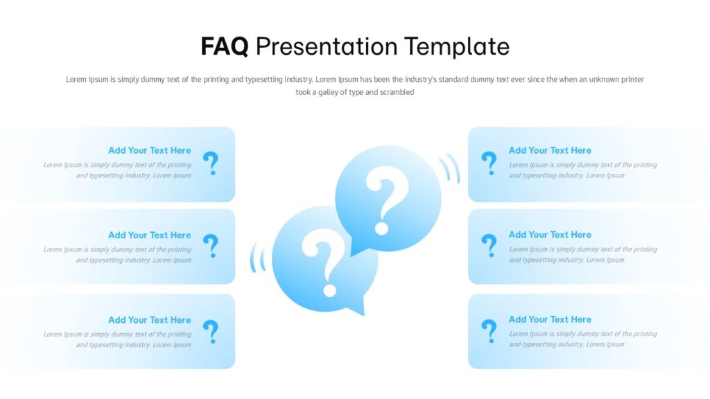 This FAQ Presentation Template provides a clean, organized layout designed to help presenters address common questions with clarity and visual consistency. The slide features six question-and-answer cards arranged symmetrically around two large speech-bubble icons in the center, each containing a bold question mark that reinforces the theme. Soft blue gradients, rounded rectangles, and minimalist typography create a friendly and approachable look, making this design ideal for onboarding sessions, product demos, customer support overviews, training decks, or business presentations that require structured responses.