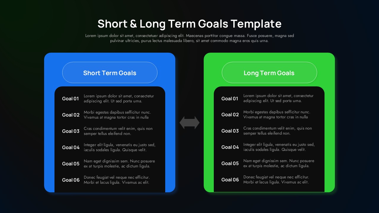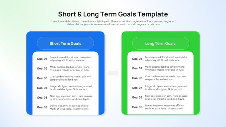 The balanced, side-by-side structure encourages comparison and alignment between immediate actions and future ambitions. A subtle arrow icon placed between the panels visually reinforces progression and continuity, making this short and long term goals slide ideal for strategy discussions, performance reviews, or project planning sessions. Rounded corners, soft shadows, and clean typography contribute to a modern, professional look that fits corporate, educational, and startup presentations alike.