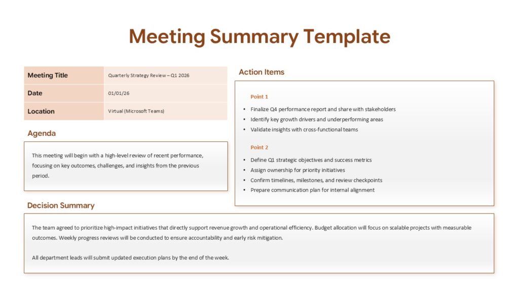 • Captures meeting outcomes clearly and professionally in a single slide.