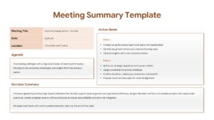 • Dedicated sections for agenda overview, action items, and decision summary.