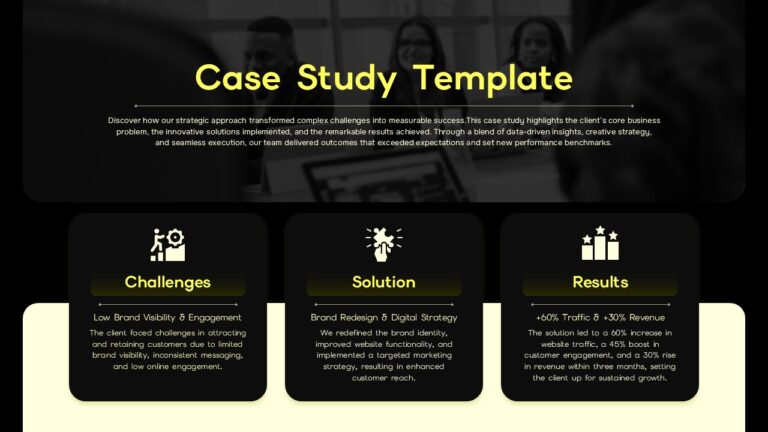 This case study presentation template offers a clear, structured way to communicate business challenges, strategic solutions, and measurable results. Designed with a sleek dark background and vibrant yellow highlights, the layout emphasizes clarity and readability while giving your case study a polished, professional look. Whether you are summarizing a marketing initiative, operational improvement, or client success story, this case study template ensures that each stage of the process is visually distinct and easy to follow. The template presents the core sections—Challenges, Solution, and Results—through clean, icon-led panels, helping audiences quickly grasp the narrative and understand the impact delivered. Built for smooth customization, it allows you to adapt text, icons, and visuals to align with your project scope and brand style. By using this case study template, presenters can streamline storytelling, enhance engagement, and reinforce the value of their strategic work with confidence.