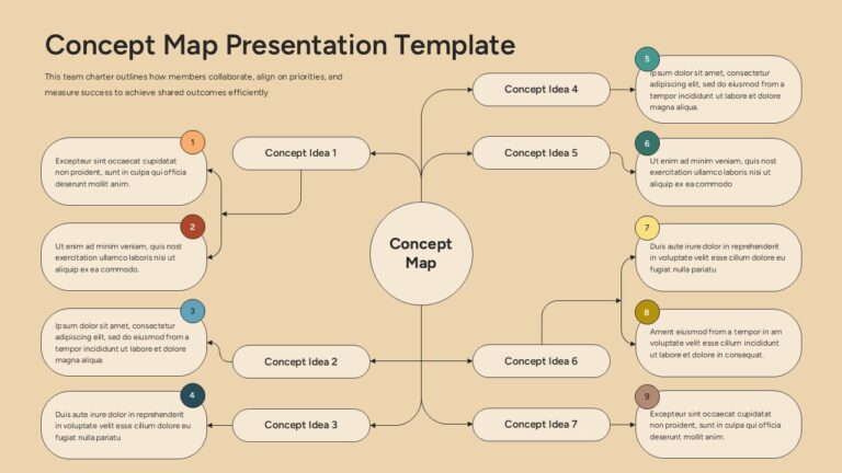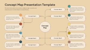 This concept map diagram presentation template helps you structure complex information around a central idea while clearly showing how supporting concepts connect and interact. The slide features a prominent central hub labeled as the core concept, with multiple branching concept ideas arranged symmetrically on both sides. Each idea is linked using curved connectors and supported by descriptive text cards, making it easy for audiences to follow relationships and logical flow. The warm background and soft, rounded shapes create a calm, professional visual that keeps attention focused on content rather than clutter.