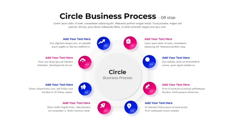 This Circle Business Process slide is designed to visualize workflows that move through clear, repeatable stages in a continuous loop. Built around an eight-step circular structure, the layout places a central concept in the middle and surrounds it with evenly spaced nodes, each marked with numbers, icons, and short text areas. This structure makes the Circle Business Process easy to follow, helping audiences understand how each phase connects logically to the next. Clean typography, soft shadows, and balanced spacing ensure that complex operations are communicated with clarity and visual consistency.