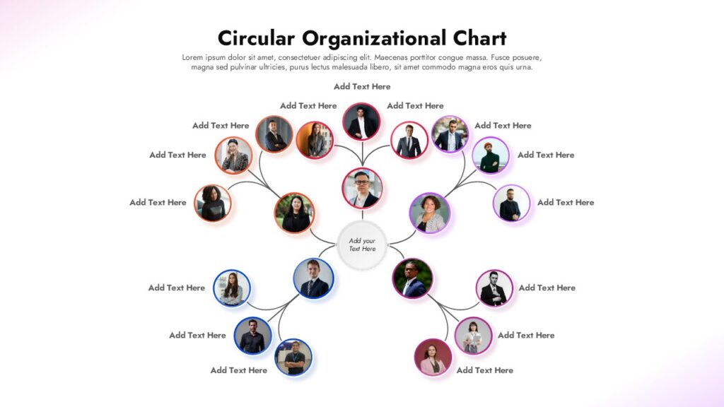 Fully editable in both PowerPoint and Google Slides, the layout allows you to replace images, adjust color accents, modify text, and reorganize nodes without disrupting alignment. Whether you are introducing a new leadership team, explaining a company restructure, or presenting a departmental breakdown, this circular organizational chart hierarchy template delivers a modern, professional way to visualize your organizational structure.