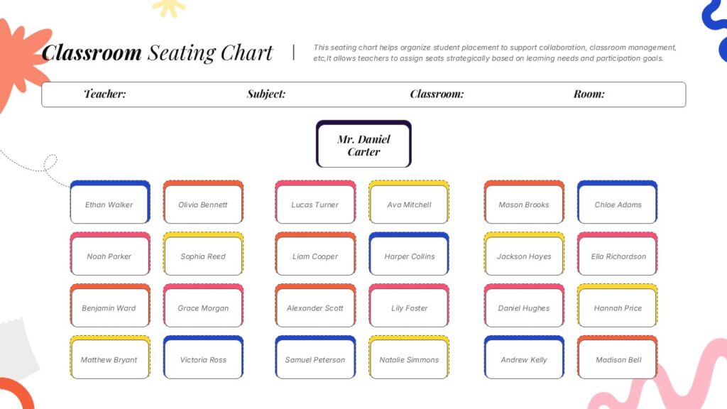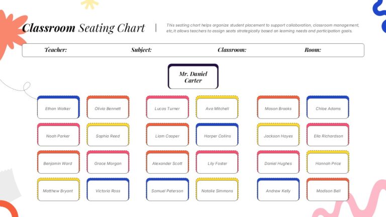 This Classroom Seating Chart Template for PowerPoint & Google Slides provides a well-organized 6×4 grid layout accommodating 24 students with clear teacher positioning. Features bright, cheerful color coding with coral, pink, yellow, and blue accent borders for each student name box. The clean design includes administrative header fields for teacher name, subject, classroom, and room information, complemented by decorative floral elements and modern typography for enhanced visual appeal.