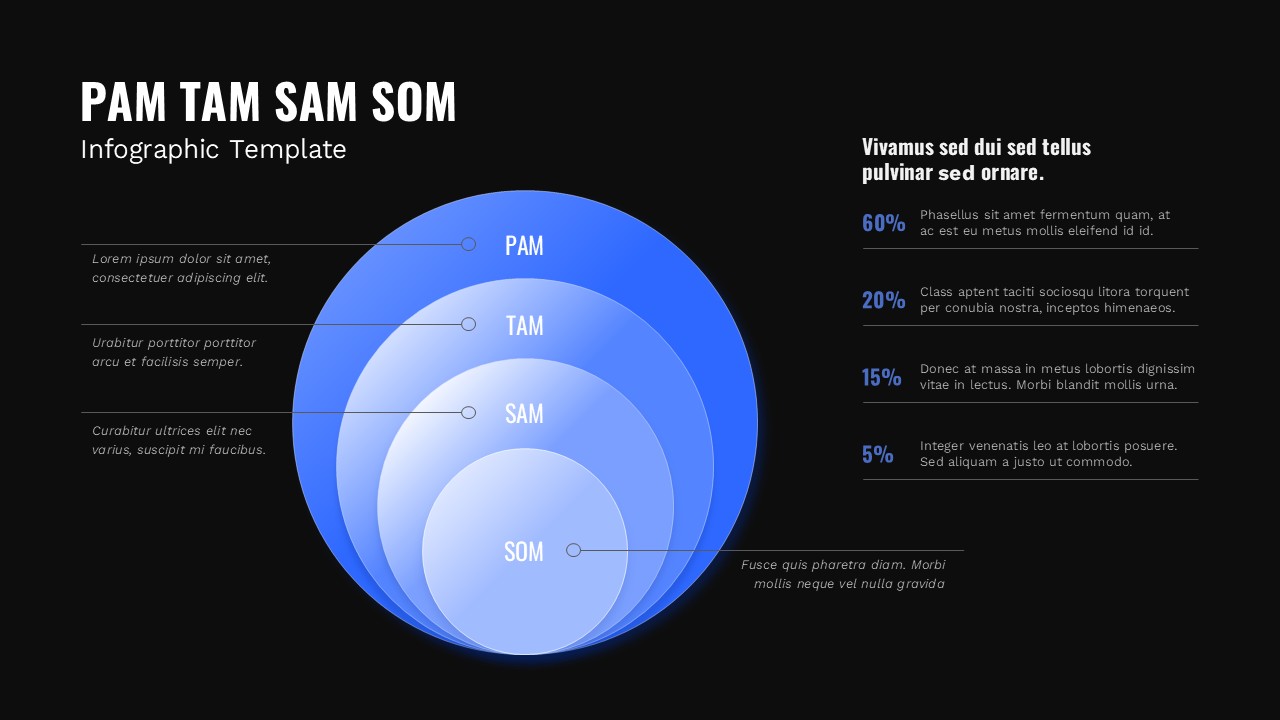 Blue concentric circle infographic labeled PAM, TAM, SAM, SOM with percentage breakdown and side text callouts.