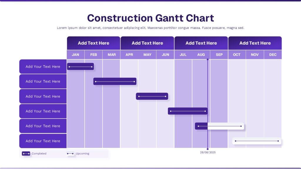 Fully editable in PowerPoint and Google Slides, this Gantt Chart template allows users to rename tasks, adjust timelines, update progress indicators, and extend the schedule as projects evolve. Whether used for residential builds, commercial construction, infrastructure projects, or renovation planning, this slide delivers a professional, practical way to manage timelines, communicate progress, and keep teams aligned from start to completion.