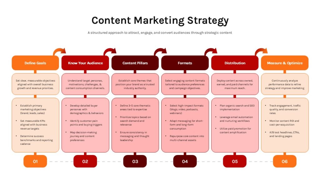 Six-step content marketing strategy roadmap slide with horizontal layout, arrows, and orange-red rounded content boxes.