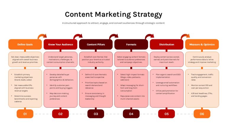 The layout supports a logical progression, helping teams align marketing objectives with measurable KPIs, audience insights, thematic content pillars, and multi-channel distribution tactics. With consistent spacing, subtle color transitions from orange to deep red, and clearly numbered stages (01–06), the design ensures your Content Marketing Strategy is easy to follow and presentation-ready. Editable text placeholders make it simple to customize goals, buyer personas, SEO tactics, content formats, and optimization metrics according to your organization’s needs.