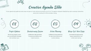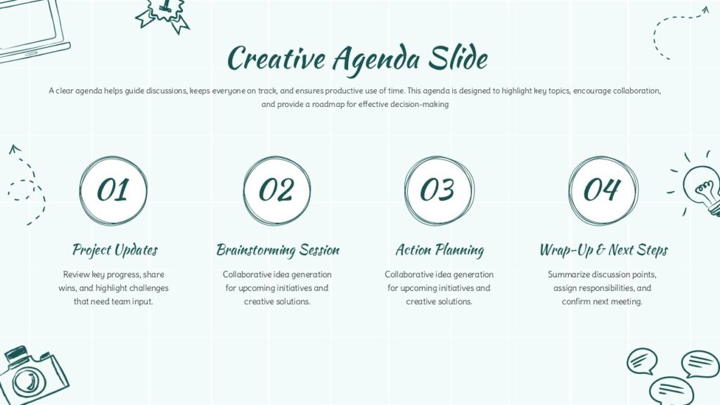 Team leaders, project managers, facilitators, educators, workshop hosts, and anyone needing a structured yet creative agenda slide for meetings or collaborative sessions.
