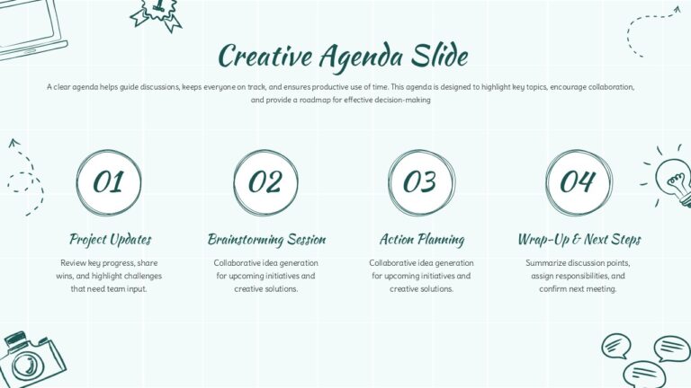 This creative 4 stage agenda slide offers a structured yet visually refreshing way to outline meeting topics, ensuring clarity, engagement, and smooth discussion flow. The layout features four numbered circular markers arranged horizontally, each accompanied by a title and concise description. The design incorporates soft grid lines, minimalist doodle-style illustrations, and a calming green palette, creating an inviting aesthetic suited for team sessions, workshops, and strategic discussions. This creative 4 stage agenda slide template helps reinforce focus while adding personality to your presentation, making it ideal for teams that value both clarity and visual appeal.