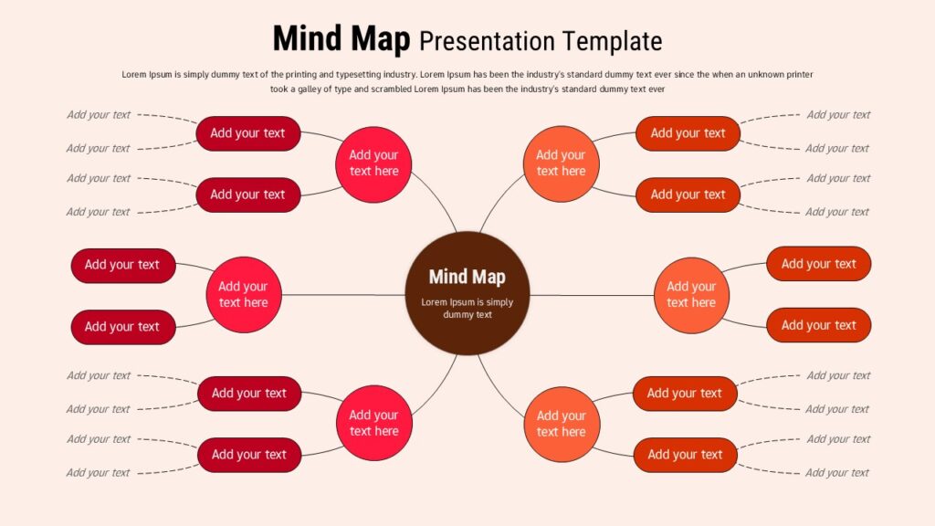 Ideal for brainstorming, planning, and concept development, this mind map diagram presentation helps transform abstract thoughts into structured visuals. Each branch can represent categories, themes, or subtopics, while the smaller nodes allow further breakdown into details or action items. The warm color palette adds visual hierarchy without overwhelming the slide, guiding attention naturally from the central idea to supporting elements. This makes the diagram effective for both creative and strategic discussions.