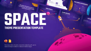 This space theme presentation template is crafted to deliver visually striking storytelling inspired by astronomy, exploration, and futuristic concepts. The design features a bold purple gradient background combined with vibrant cosmic illustrations, including planets, rockets, and orbital elements, creating an immersive and imaginative visual experience. Large typography and layered slide previews in the background immediately establish a strong visual hierarchy, making this space theme presentation template ideal for capturing attention from the very first slide.
