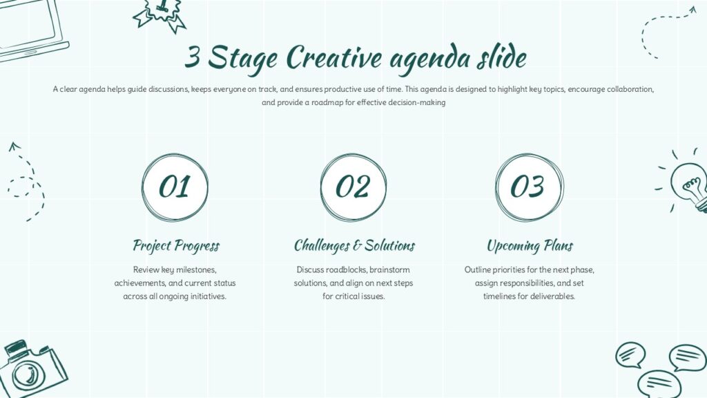 This Free 3 Stage Creative Agenda Slide Template for PowerPoint & Google Slides offers a visually charming and well-structured layout designed to streamline meeting discussions and guide teams through essential topics. The slide features three circular stage markers arranged horizontally, each paired with a dedicated heading and descriptive text area. Surrounded by hand-drawn doodle-style icons, the design introduces a light, artistic tone that keeps attention focused while maintaining a professional level of clarity. The soft grid background and monochromatic green accents enhance readability without overwhelming the content, making it ideal for collaborative sessions or team updates.
