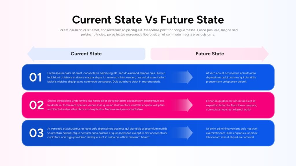 Large rectangular blocks span the width of the slide, pairing current-state descriptions directly with future-state outcomes. Directional arrows reinforce the idea of transition, helping audiences visually follow how each condition evolves. This current state vs future state comparison template is particularly useful for business reviews, process-improvement proposals, change-management plans, digital-transformation initiatives, and roadmap discussions.