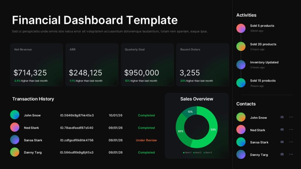 Built for flexibility, this financial dashboard adapts seamlessly to monthly reports, quarterly reviews, and real-time performance summaries. Transaction history tables, activity timelines, and contact lists are arranged in a clear grid system, ensuring balance between data density and readability. Subtle gradients and rounded containers guide the viewer’s eye without distracting from the numbers. Whether used as a standalone slide or as part of a larger deck, the composition keeps financial data organized and visually consistent across presentations.