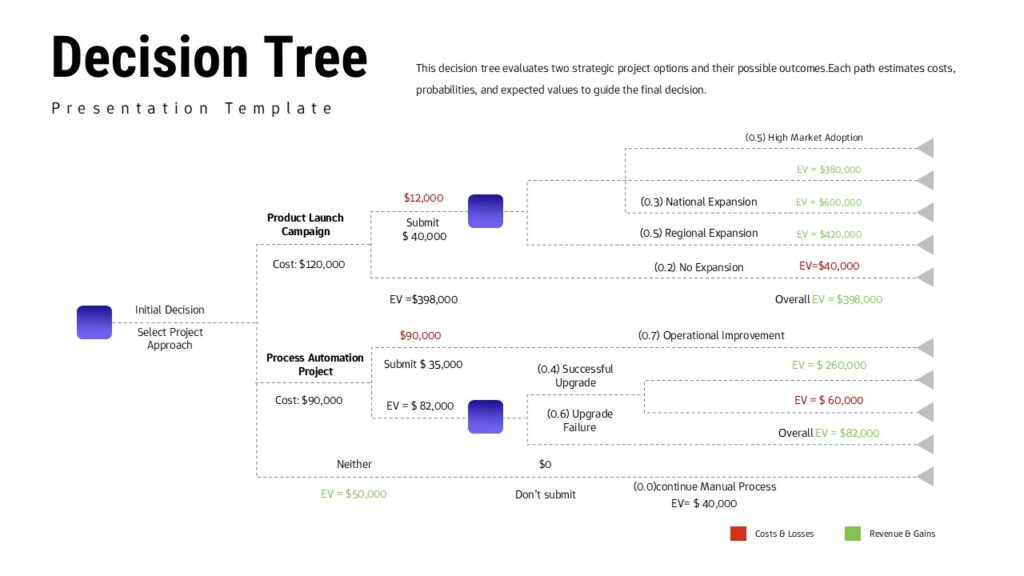 This Decision Tree Template for PowerPoint & Google Slides is ideal for strategic business decision-making presentations requiring financial analysis and risk assessment. Executive teams, project managers, and strategic planners benefit from its structured approach to comparing multiple investment options, evaluating ROI scenarios, and presenting probability-based outcomes. The template supports boardroom presentations, project proposal evaluations, and strategic planning sessions where data-driven decision frameworks are essential for stakeholder communication.