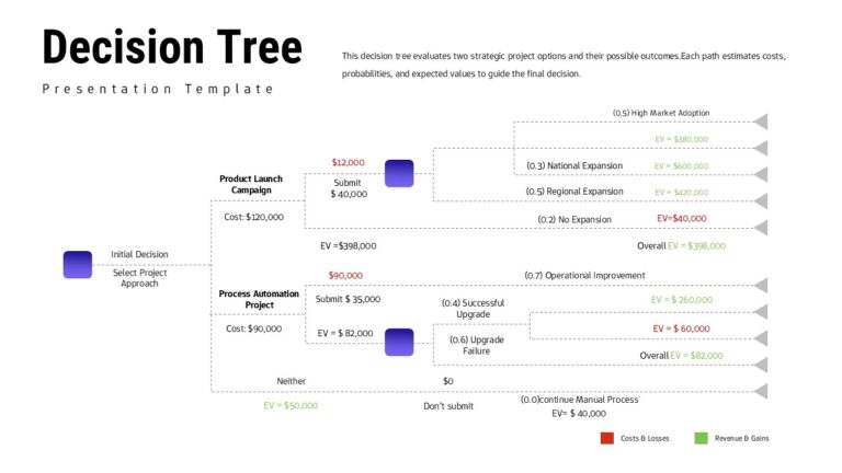 This template is perfect for executive teams, strategic planners, project managers, business analysts, investment consultants, and management consultants who need to present complex decision scenarios, evaluate project proposals, conduct risk assessments, or facilitate strategic planning sessions requiring probability-based financial analysis.