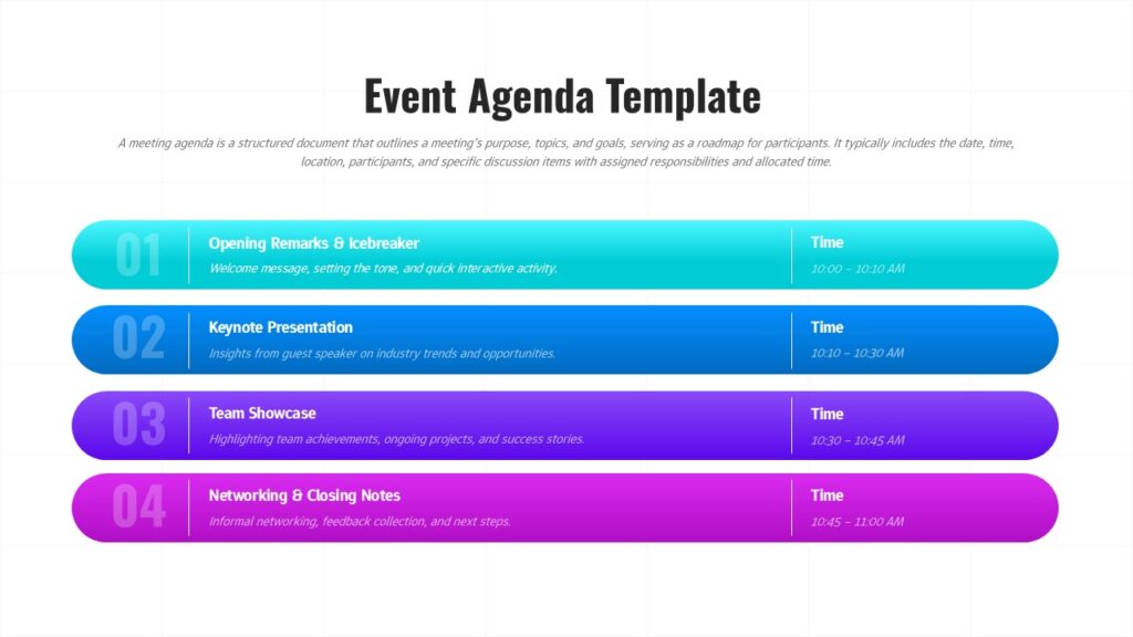 This Event Agenda slide is designed to help presenters organize and communicate meeting or event schedules in a clear, visually engaging format. Featuring four horizontally aligned items, the layout presents each session with a numbered label, title, short description, and dedicated time slot. This structure makes it easy for participants to understand the flow of the event at a glance while keeping attention focused on what comes next.