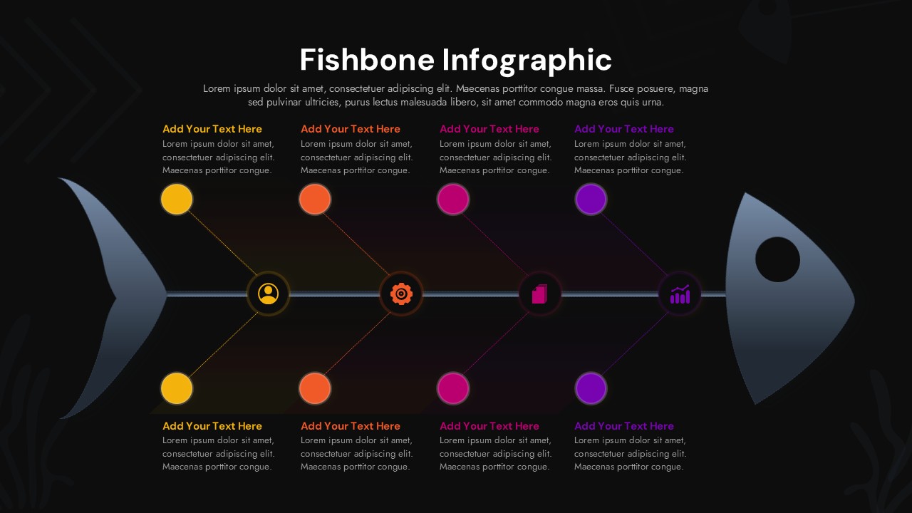 Fishbone infographic slide with horizontal spine, color-coded cause branches, circular icons, and editable text areas.