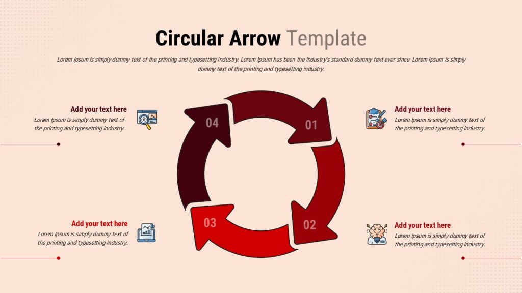 This four-step circular arrow diagram Template for PowerPoint & Google Slides provides a clear and engaging way to present any repeating workflow, continuous improvement loop, or cyclical business process. Designed with four smoothly connected arrows arranged in a clockwise loop, this diagram helps audiences instantly understand progression and continuity. The template’s central circular shape is paired with four numbered arrow segments in contrasting red tones, ensuring each phase of the cycle stands out while still maintaining visual harmony. Around the loop, text placeholders and illustrated icons support concise descriptions, enabling you to highlight key actions, KPIs, or milestones for each stage.