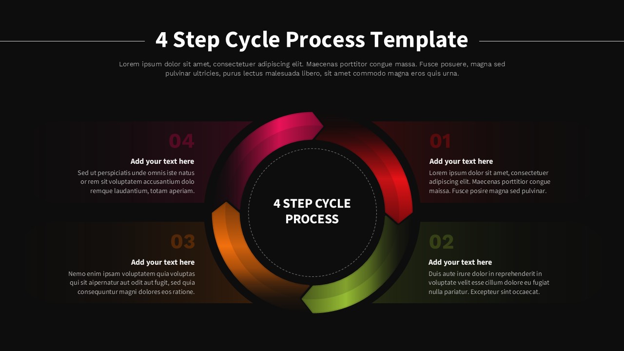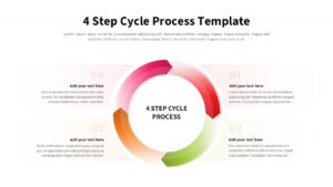 Four step cycle process diagram slide with a circular ring, four colored segments, central title, and surrounding text areas white