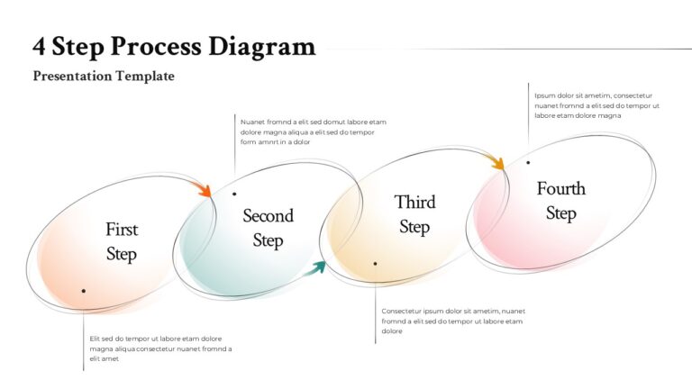 This 4-step process diagram template for PowerPoint and Google Slides provides a clean, modern, and visually fluid way to illustrate sequential workflows, phased strategies, or multi-stage business processes. Designed with overlapping organic shapes, each stage features a soft gradient fill and elegant outline that create a smooth visual transition from one step to the next. The subtle arrow indicators reinforce direction and flow, helping audiences quickly understand the progression of activities. This layout is ideal for showcasing step-by-step methodologies, operational cycles, training modules, project pathways, or transformation processes.