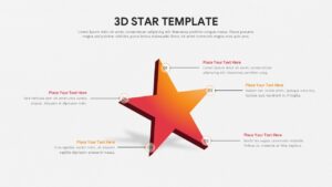 This Free 3D Star Template for PowerPoint & Google Slides provides a visually striking hub-and-spoke layout with a vibrant orange-to-red gradient 3D star as the central focal point. Features five numbered connection points (01-05) radiating from the star, each linked to dedicated text placeholder areas via clean connecting lines. The template includes both light and dark background variants, maintaining professional aesthetics with subtle drop shadows and modern color-coded headers.
