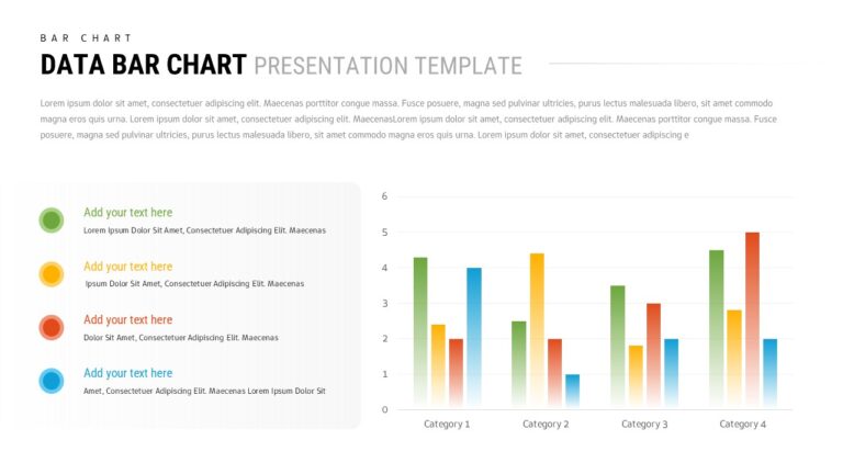 This Free Data Bar Chart Template for PowerPoint & Google Slides provides a clean, professional design featuring a grouped bar chart with four data series. The template includes a left sidebar legend with colored circular icons (green, yellow, orange, and blue) and customizable text sections. The main chart displays four categories with values ranging from 0-6, utilizing well-balanced white space and modern minimalist styling for maximum visual impact.