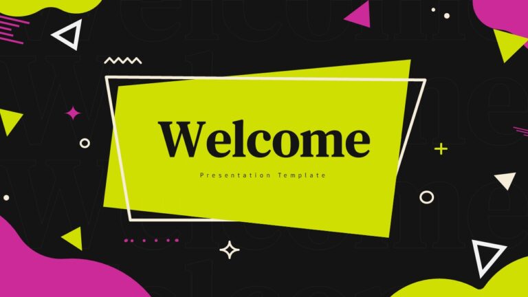 This vibrant geometric welcome presentation template combines bold shapes, dynamic layering, and energetic color contrasts to create a memorable introduction slide for any professional or creative deck. The design features a striking lime centerpiece framed by angular outlines, set against a deep black background filled with abstract geometric accents in pink, yellow, and white. These elements work together to guide viewer attention toward the central “Welcome” message, ensuring strong visual impact from the very first slide.