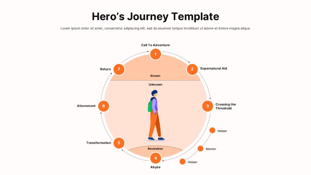 Visualize the complete narrative arc with this Hero’s Journey Circular Diagram Template for PowerPoint & Google Slides. Designed around a clean circular layout, this slide maps seven essential storytelling stages—Call to Adventure, Supernatural Aid, Crossing the Threshold, Abyss, Transformation, Atonement, and Return—arranged in a continuous loop to emphasize progression and growth. The central illustration of a character placed between the “Known” and “Unknown” worlds reinforces the emotional and structural shift that defines the hero’s path.