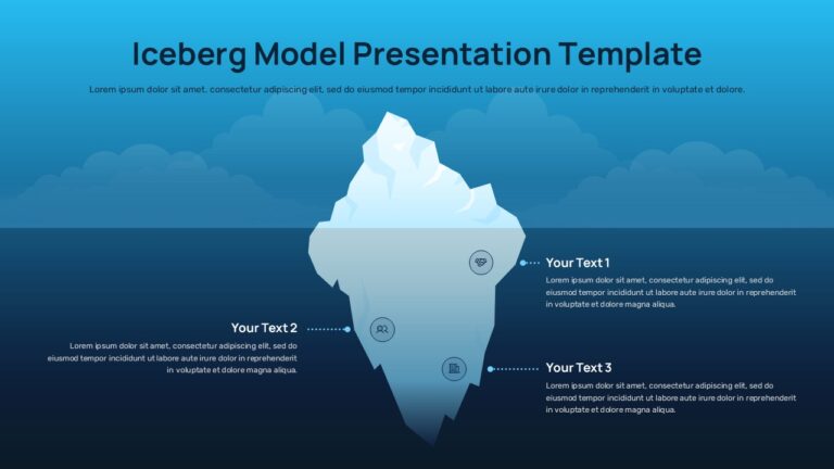 Optimized for PowerPoint and Google Slides, this template features a clean, modern illustration with clearly defined callout areas. Text placeholders are positioned on both sides of the iceberg, allowing presenters to label visible elements above the surface and hidden drivers below. Subtle gradients and layered shapes create depth without overwhelming the message, while consistent icon markers guide the audience through each explanatory point. The balanced composition ensures readability on large screens and maintains clarity in virtual presentations.