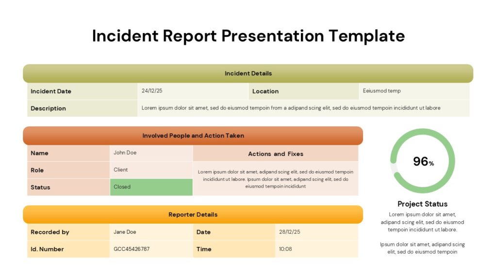 This template is ideal for HR teams, safety officers, compliance managers, project managers, and operations teams who need to document and present incident reports. It is also suitable for corporate environments, healthcare facilities, educational institutions, and organizations requiring structured incident tracking.