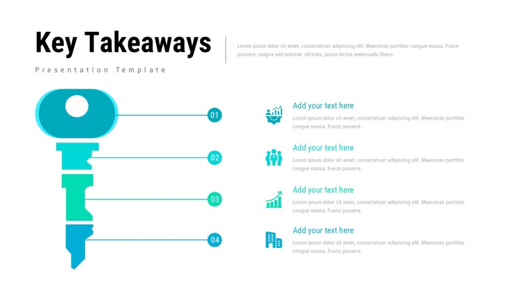 This Key Takeaways Template for PowerPoint & Google Slides provides a distinctive key-shaped visual metaphor with a four-point horizontal structure. The design features numbered callouts (01-04) extending from different parts of the key visual, connecting to corresponding content sections with accompanying icons. Available in both light and dark themes, the template uses a modern flat design aesthetic with turquoise gradient accents, maintaining professional readability across both versions.