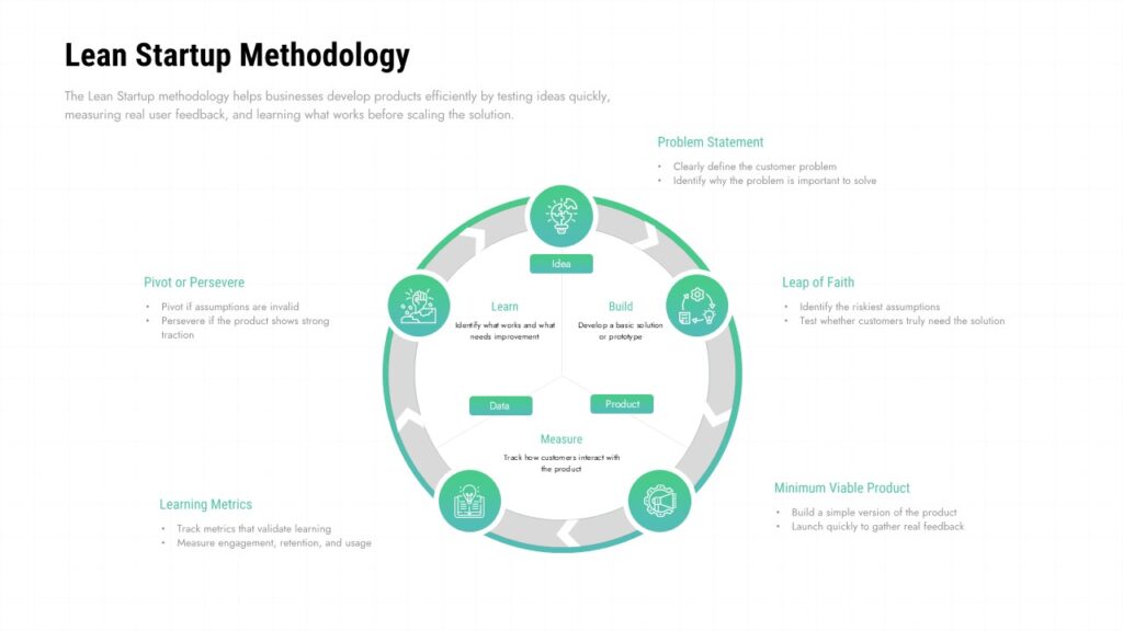 This Lean Startup Methodology Template for PowerPoint & Google Slides provides a comprehensive visual framework showcasing the Build-Measure-Learn cycle through a prominent circular diagram. The template features five detailed content sections surrounding the central flow, including Problem Statement, Leap of Faith, Minimum Viable Product, Learning Metrics, and Pivot or Persevere phases. Clean design elements utilize vibrant teal accent colors against professional backgrounds, with clear icons and connecting arrows that illustrate the iterative process flow.