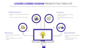 Capture key project insights with this professionally designed Lessons Learned Diagram Slide Template for PowerPoint & Google Slides. This structured lessons learned diagram visually organizes four critical pillars—Continuous Improvement, Clear Planning, Risk Awareness, and Strong Communication—around a central idea hub. A modern laptop illustration with a glowing lightbulb icon anchors the layout, symbolizing innovation and reflection, while circular icon frames connected by clean lines create a balanced, easy-to-follow composition.