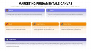The template emphasizes visual storytelling by integrating diagrams, circular frameworks, and structured information blocks that guide viewers through the foundations of marketing strategy. Slides such as the marketing mix diagram and marketing fundamentals canvas help presenters illustrate relationships between product, price, place, promotion, and broader marketing strategies. This Marketing Fundamentals presentation template also features modular layouts that allow users to duplicate sections, reorder content, or add new insights without disrupting the design flow.