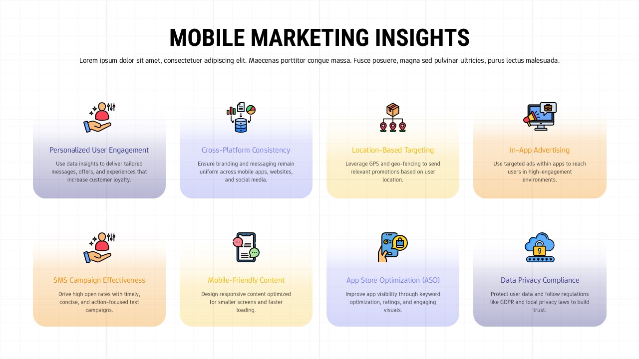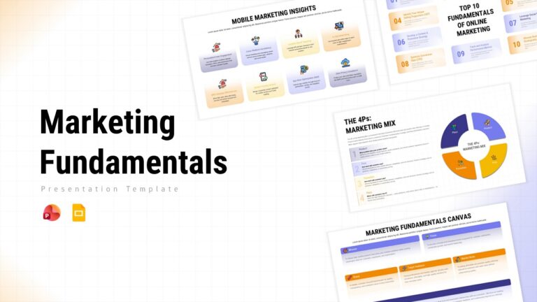 The Marketing Fundamentals Strategy Template for PowerPoint & Google Slides is a comprehensive presentation framework designed to help professionals explain core marketing concepts with clarity and visual impact. This modern slide collection organizes essential topics such as the 4Ps marketing mix, online marketing principles, marketing insights, and strategic planning into clean, structured layouts that make complex information easier to communicate. Each slide combines well-balanced typography, colorful content cards, and intuitive visual diagrams so audiences can quickly understand key ideas without feeling overwhelmed by data or dense text.
