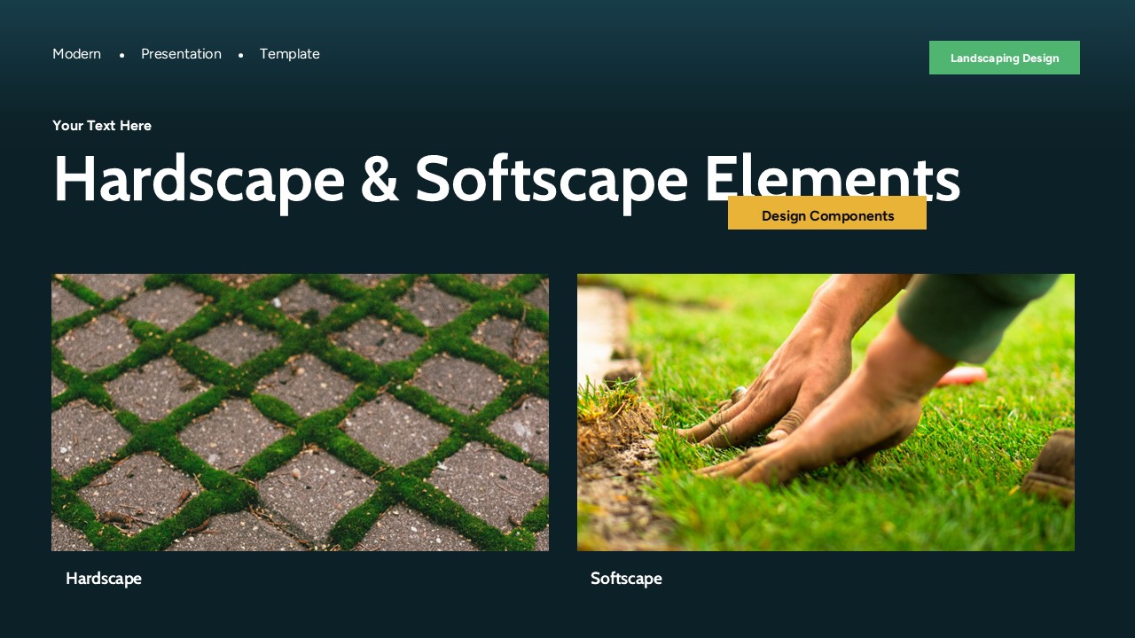 Landscaping design presentation slide featuring dark green gradient background, bold yellow headings, and image-based content layouts.