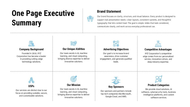 This one page executive summary slide is designed to help professionals communicate complex business information with clarity and structure. Built on a clean grid layout, the template divides key messages into clearly defined sections, allowing decision-makers to grasp the full picture at a glance. From brand statement and company background to objectives and competitive advantages, each content block is visually separated with subtle dividers and consistent iconography, ensuring logical flow and easy scanning. The one page executive summary format supports concise storytelling while maintaining a polished, executive-ready appearance suitable for high-level meetings.
