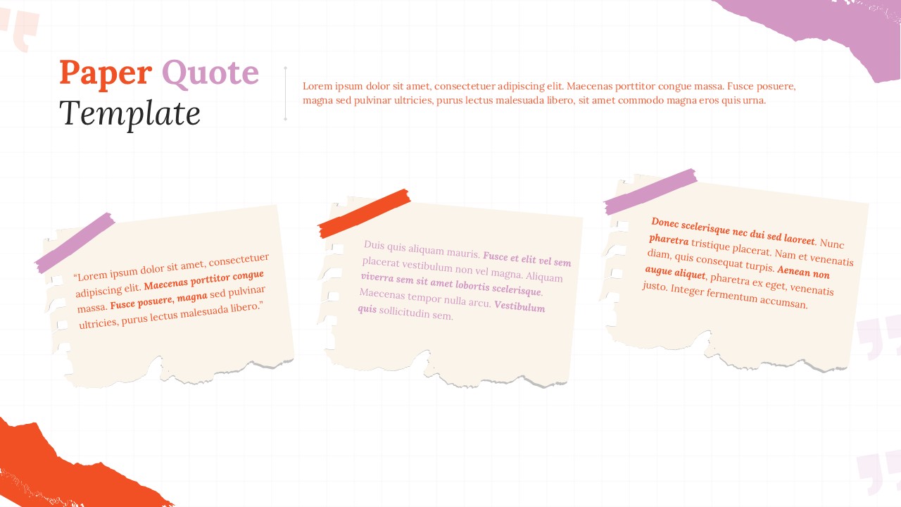 Paper Quote Template is a PowerPoint and Google Slides template designed for educators, marketers, and business presenters who need to display quotes, testimonials, or text snippets in a warm, visually engaging format. Three torn paper note cards arranged horizontally feature realistic torn edges, subtle shadows, and decorative washi tape accents in orange and purple, giving the layout an authentic scrapbook aesthetic that makes standard quote slides feel personal and memorable. Light cream and dark background versions are both included, and every color, font, and text element is fully editable in PowerPoint and Google Slides.