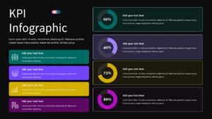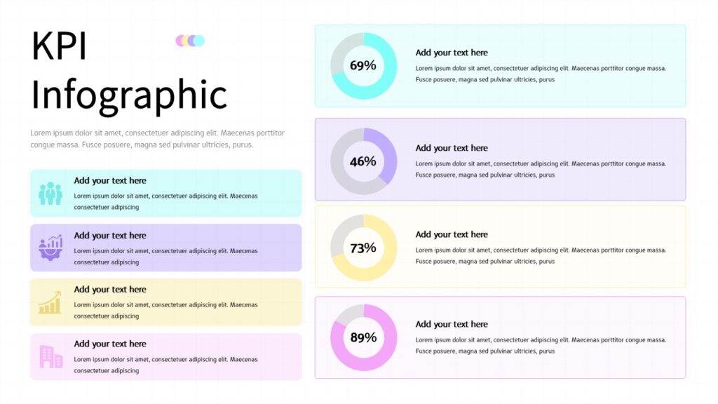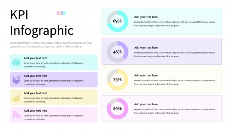 Present your performance metrics with clarity using this KPI Dashboard Infographic Template for PowerPoint & Google Slides. Designed to highlight measurable results, this KPI infographic slide features four circular progress charts displaying percentage values (69%, 46%, 73%, and 89%) alongside structured text blocks for detailed explanations. The balanced two-column layout separates visual data indicators from descriptive content, enabling audiences to quickly interpret results while understanding the context behind each KPI.