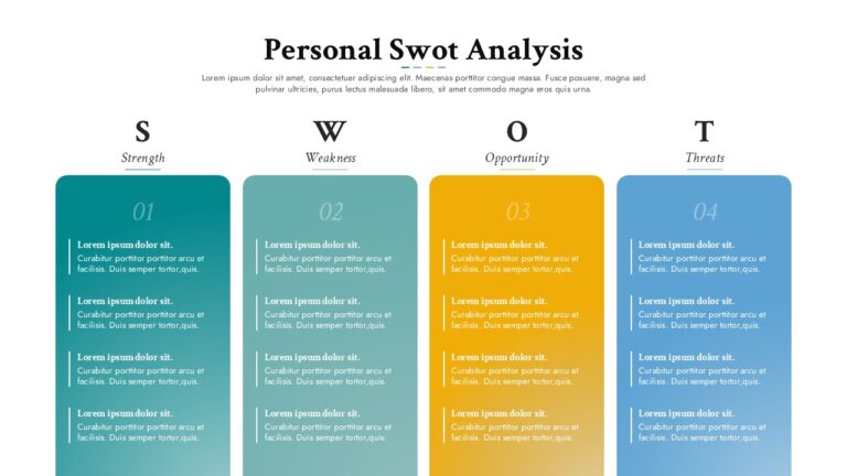 Present your self-assessment clearly and confidently with this Personal SWOT Analysis Four Column Layout Template for PowerPoint & Google Slides. Designed around the classic SWOT framework—Strengths, Weaknesses, Opportunities, and Threats—this slide organizes personal insights into four visually distinct vertical panels. Each column features a bold initial (S, W, O, T), a descriptive heading, and structured content blocks for listing key points, making it easy to communicate your personal SWOT analysis in a structured and professional format. The balanced spacing and modern typography ensure that your message remains the focal point while maintaining a clean, executive-ready aesthetic.