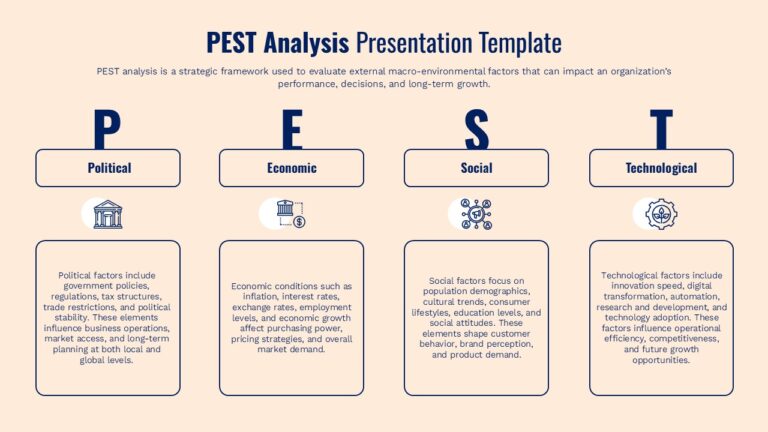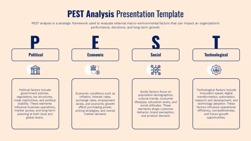 Built with clarity and strategic communication in mind, this PEST analysis template uses a soft neutral background combined with dark blue accents to maintain readability and a professional tone. Rounded content containers and consistent spacing create a balanced visual hierarchy, ensuring audiences can quickly scan and compare insights across all four dimensions. This structure is especially effective for executive briefings, strategic planning sessions, and academic presentations where clarity and structure are essential.